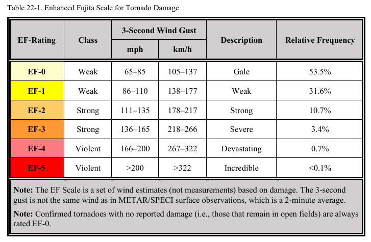 국지적 규모 상으로는 토네이도가 모든 대기 순환 현상들 중 가장 격렬하다. 토네이도의 소용돌이는 보통 수 백 야드(yard)의 지름을 가지지만 폭의 경우에는 10야드 미만에서 2마일 초과까지 다양하다. 풍속은 보통 개량 후지타 등급(Enhanced Fujita [EF] Scale)을 통해 바람 피해를 기준으로 추정된다(표 22-1 참조).