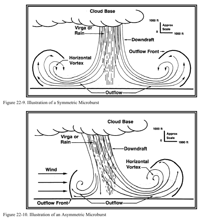 조종사는 asymmetrical microbursts를 인지해야 한다(그림 22-10 참조). 왜냐하면 이러한 마이크로버스트의 outflow에 진입하였을 때 상당한 대기속도 증가가 발생하지 않거나, 혹은 이러한 마이크로버스트를 빠져나올 때 발생하는 차후의 대기속도 감소량이 대기속도 증가량보다 훨씬 클 수 있기 때문이다.