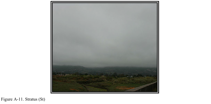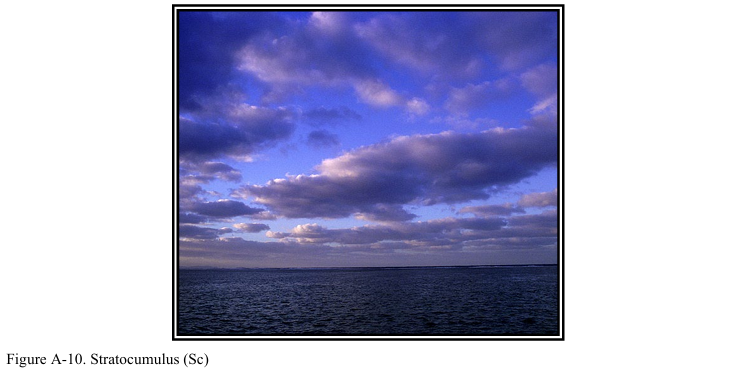 그림 A-10의 층적운은 하나 이상의 고도에서 둥근 덩어리나 두루마리 모양으로 이루어진 조각이나 층의 형태로 나타난다. 구름은 회색이거나 희끄무레하며 항상 어두운 부분을 가진다. 때로는 구름 요소들이 평행한 띠의 형태로 배열되기도 한다. 원근법으로 인해 이들이 수평선을 향하여 수렴하는 것처럼 보일 수 있다. 구름이 렌즈나 아몬드 모양으로 발생하기도 하지만 이는 상당히 드문 경우이다.