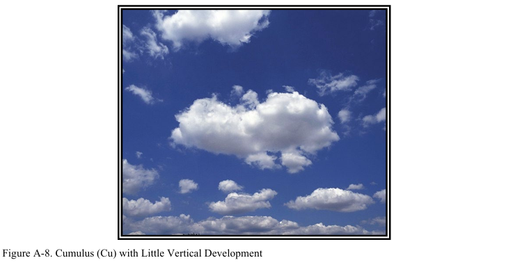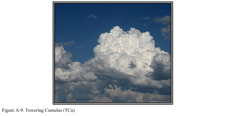 수직 발달이 적은 적운의 경우 조종사는 약간의 난기류가 존재하고 심한 착빙 현상은 없을 것으로 예상할 수 있다(그림 A-8 참조). 허나 탑적운(즉, 강한 발달을 보인 적운)의 경우 조종사는 매우 강한 난기류가 존재하고 결빙고도(기온이 영하로 떨어지는 고도) 너머에서는 약간의 맑은 착빙(clear icing)이 있을 것으로 예상할 수 있다. 탑적운은 뇌우의 첫 번째 단계(towering cumulus stage)로도 불린다(그림 A-9 참조).