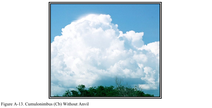 그림 A-13을 보면 구름 상단의 어느 부분도 실 같은 모양이나 모루 모양을 보이지 않는다. 구름의 돌출부에는 줄무늬가 없는 희끄무레한 덩어리가 형성되는 경향이 있다. 소나기나 뇌우가 발생할 수 있다. 번개/천둥의 유무가 적란운을 탑적운과 구분하는 기준이 된다. 적란운과 함께 적운, 층적운, 혹은 층운이 존재할 수도 있다.