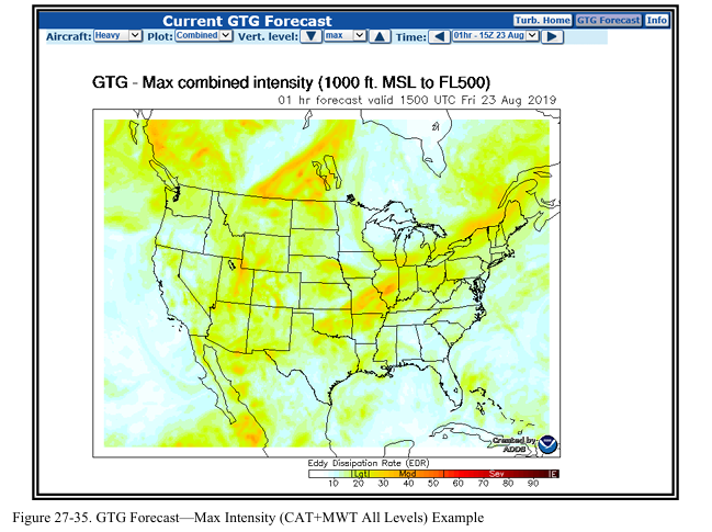 CAT와 MWT(Mountain Wave Turbulence)에 대한 GTG 예보는 그림 27-35를 참조하라.