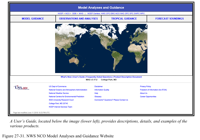 슈퍼컴퓨터에서 실행되는 수치예보(NWP: Numerical Weather Prediction) 모델은 “Model Guidance”라 알려진 지표면 및 상층 예보를 기상학자들에게 제공한다. NWS NCO는 매일 여러 모델들을 실행하며 모델이 실행된 시점(즉, 00-hour)부터 모델에 따라 수일이나 수주 후까지(예를 들어 모델 실행 후 340시간까지) 유효한 수백 개의 지표면 및 상층 자료들을 생성한다. NWS NCO의 “Model Analyses and Guidance” 웹사이트에는 User’s Guide가, 그리고 다양한 자료들에 대한 세부 정보를 제공하는 Product Description Document가 포함되어 있다(그림 27-31 참조).