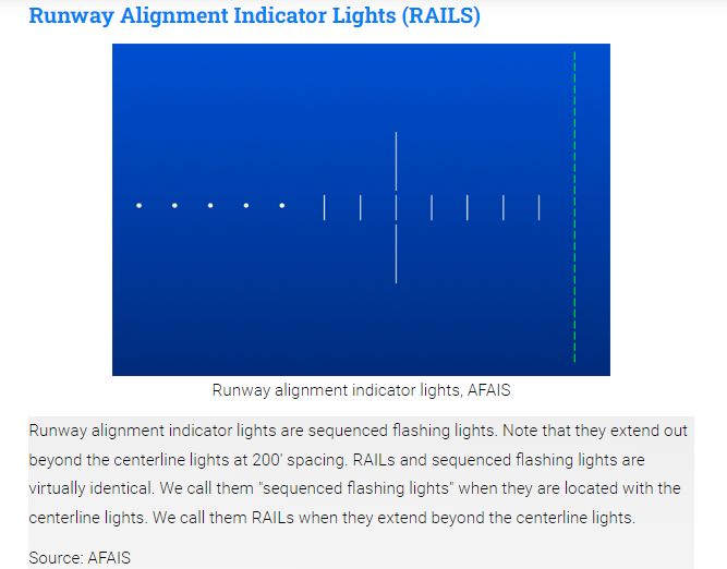 8. RAIL(Runway Alignment Indicator Lights) - 다른 등화 시스템들과 짝지어 설치되는 Sequenced Flashing Lights.