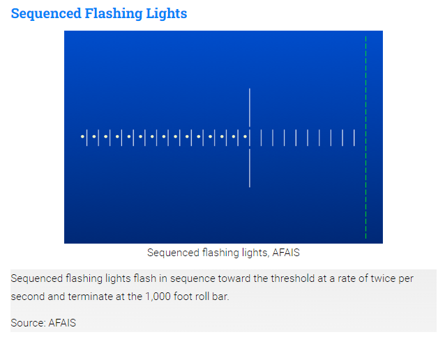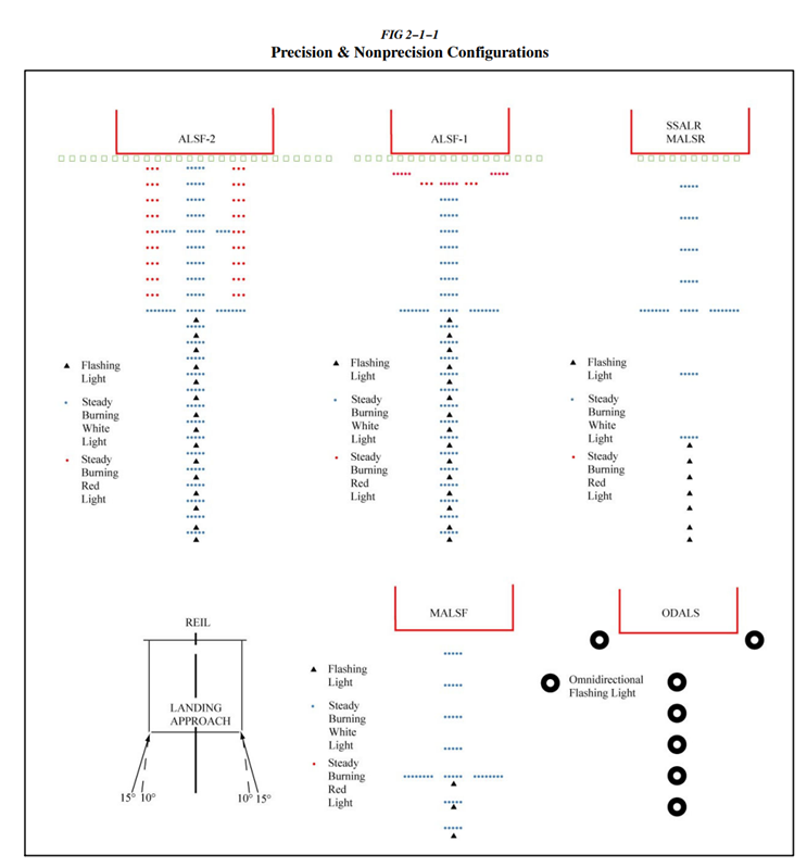 b. ALS는 활주로 시단부터 2400-3000ft(정밀 계기 활주로의 경우), 그리고 1400-1500ft(비정밀 계기 활주로의 경우) 거리의 접근 구간까지 연장되는 등화들로 구성된다. 몇몇 시스템은 sequenced flashing lights를 가지고 있는데 이는 빠른 속도(초당 2회)로 활주로를 향해 움직이는 빛의 공처럼 보인다. (그림 2-1-1 참조.)